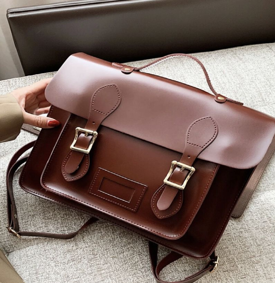 Classic brown leather satchel bag with a top handle and two front buckle closures, perfect for a collegiate style, at wholesale