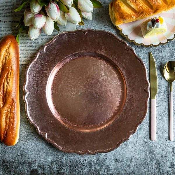 Classic iron charger plate with artisan metal texture designed to match upscale rustic events and table displays