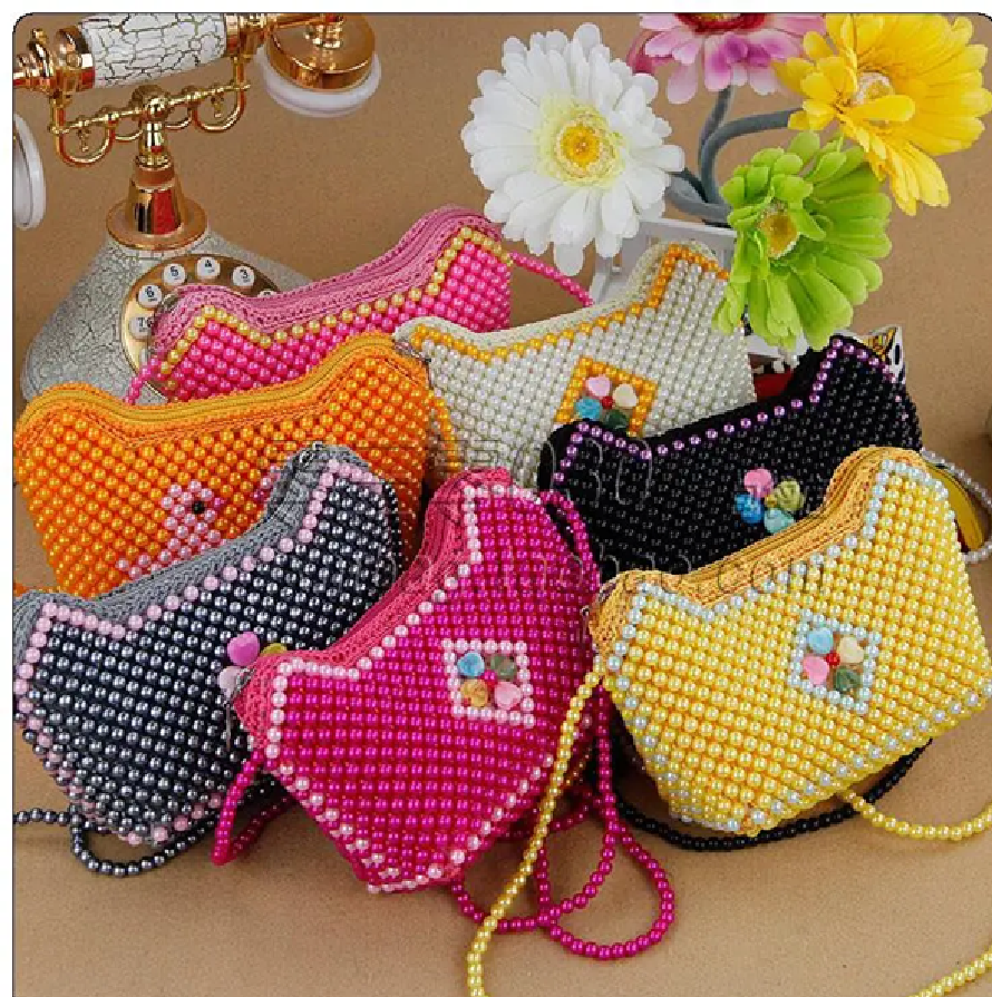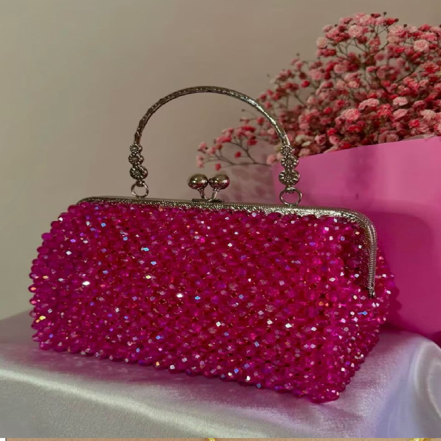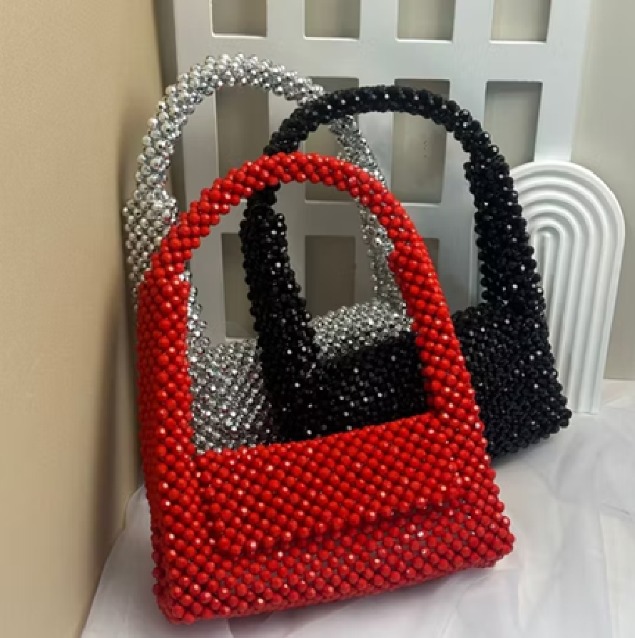 Classic white faux pearl beaded square handbag, structured top handle, front flap closur, timeless clutch,at wholesale prices.
