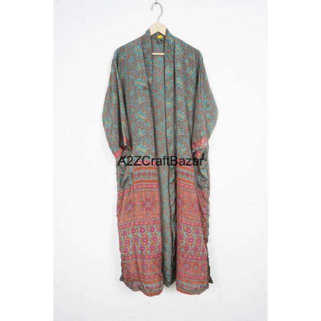 Classy Women's 100% Silk Luxury Kimono Robe V-neck Patchwork Design Drawstring Closure Full Length Long Sleeves Kimono For Girl