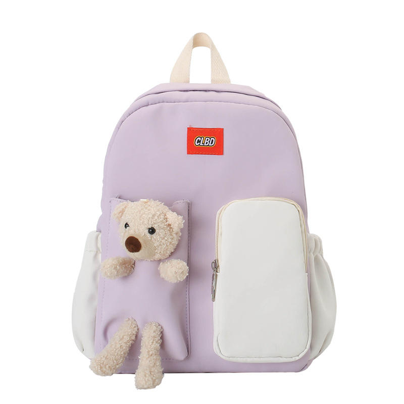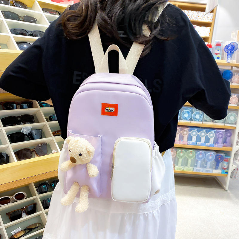 Clbd Nylon Backpack 15 Inches Solid Color With Bear Plush Toy For Student School Use