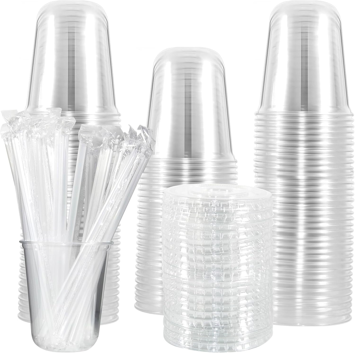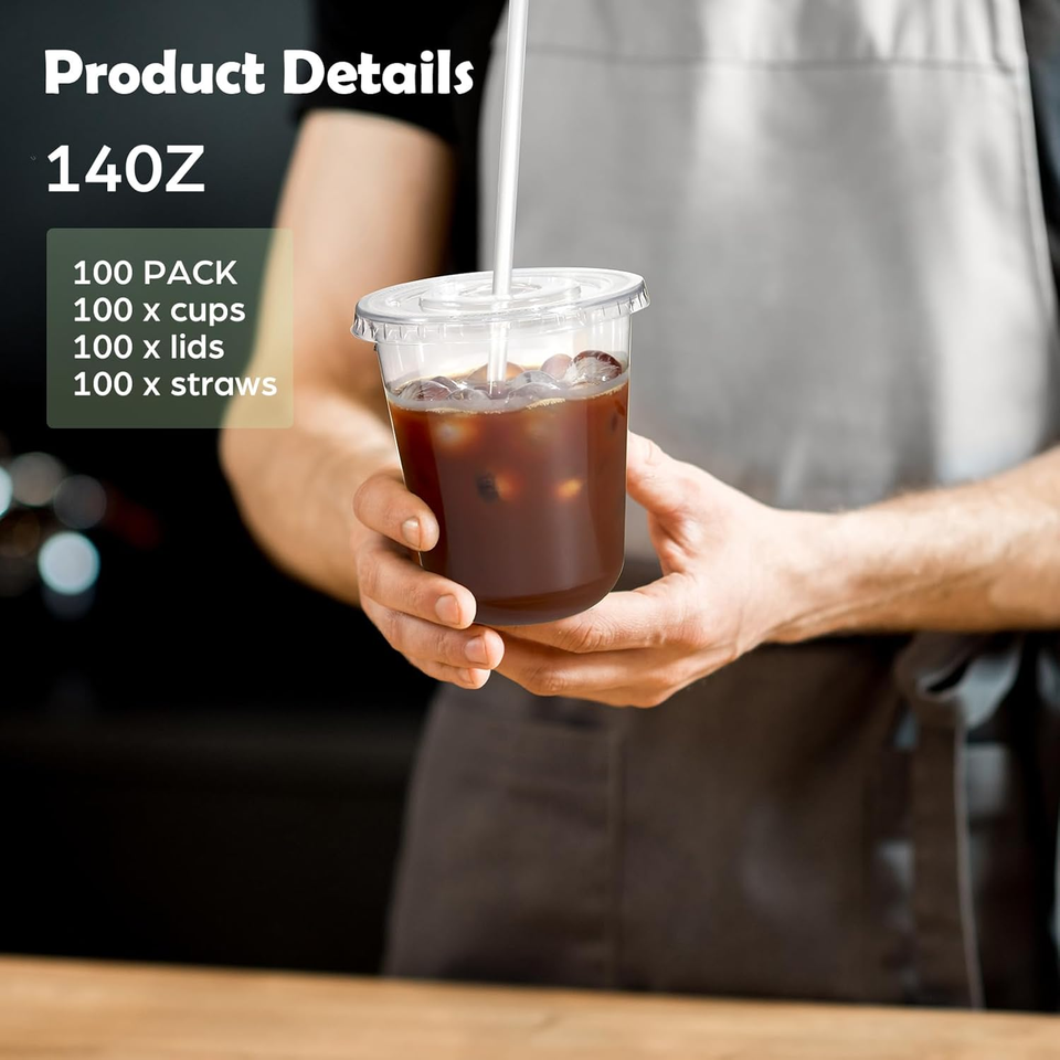 Clear Biodegradable Recyclable PET/PLA Disposable Leakproof 14oz Cold Cups with Lids & Straws for Iced Coffee & Cold Beverages