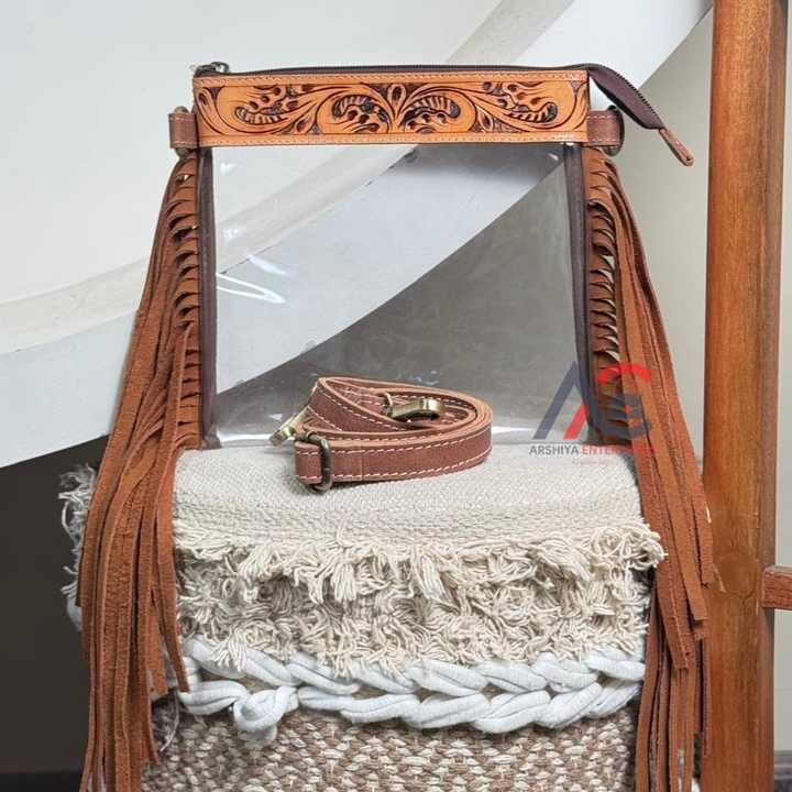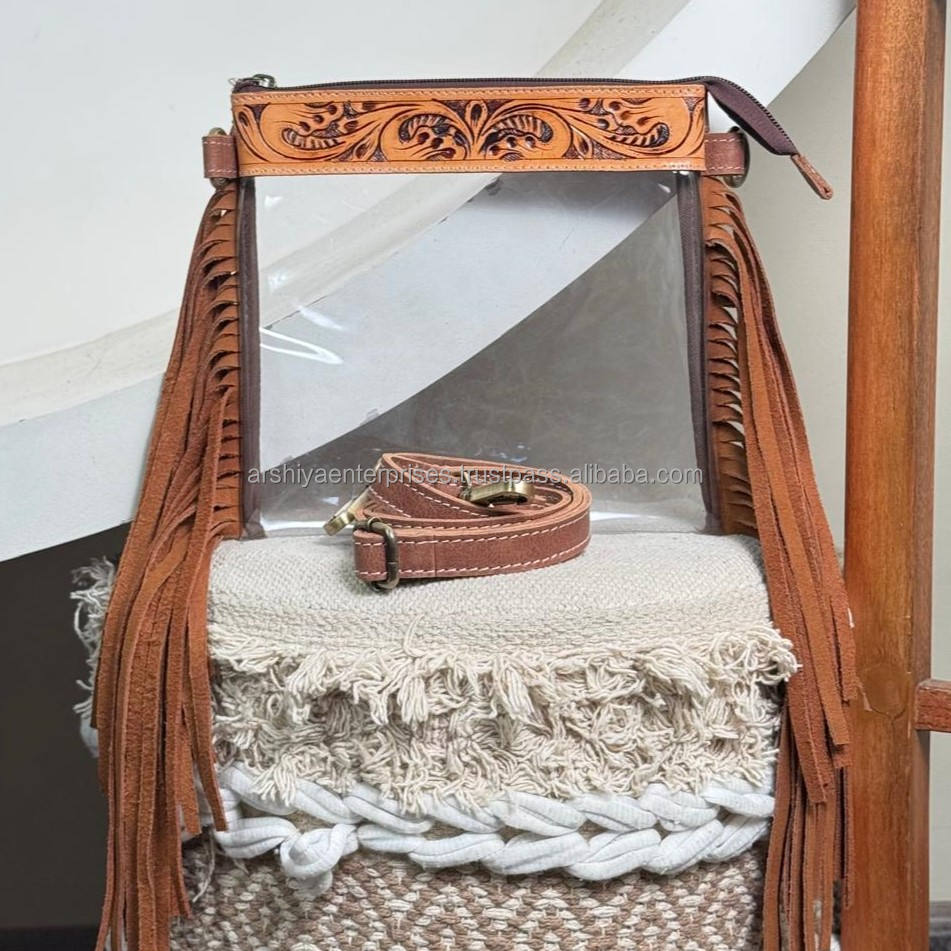Clear Crossbody Zipper Purse Stadium Approved Handbags Hand Tooled Genuine Leather Fringe Clear Concert Shoulder Bags for Women