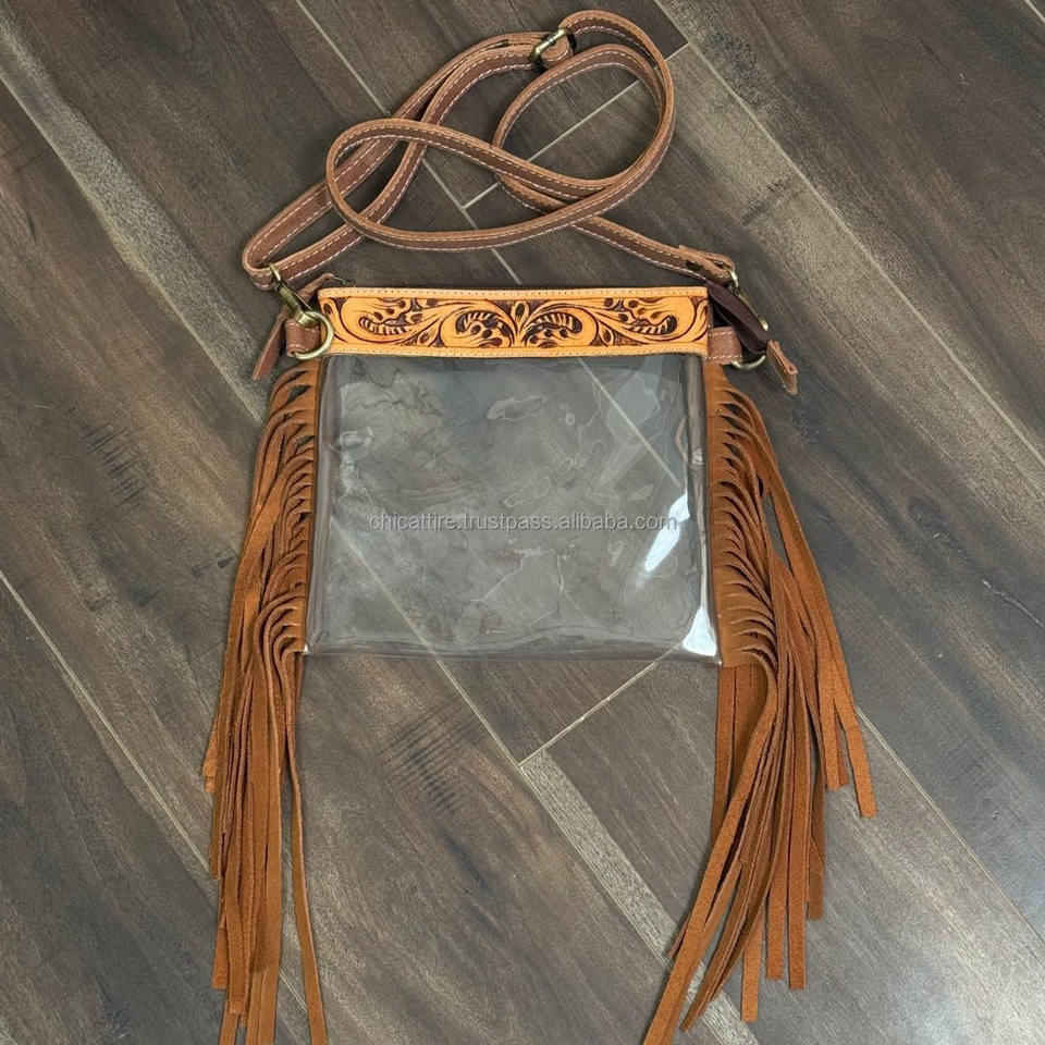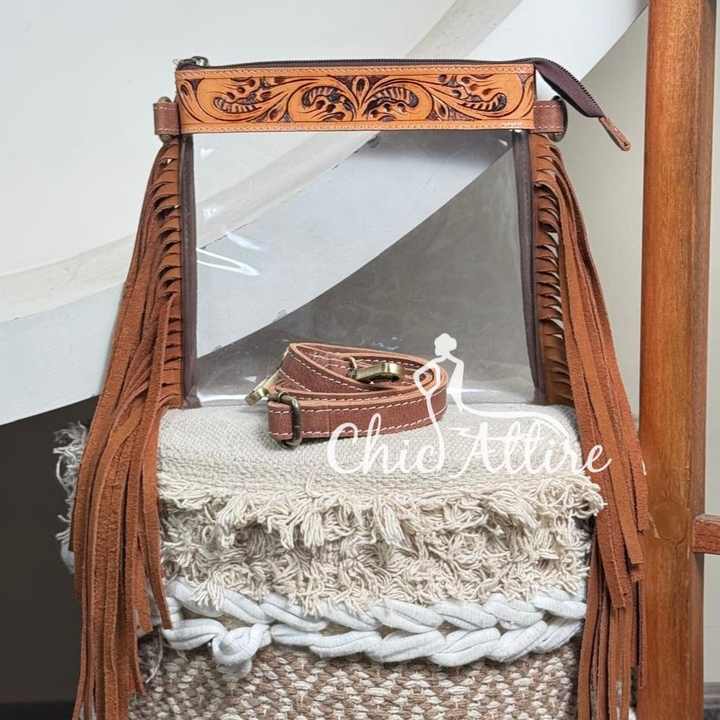 Clear Crossbody Zipper Purse Stadium Approved Handbags Hand Tooled Genuine Leather Fringe Clear Concert Shoulder Bags for Women
