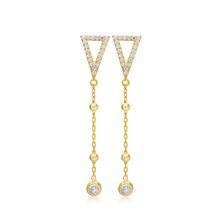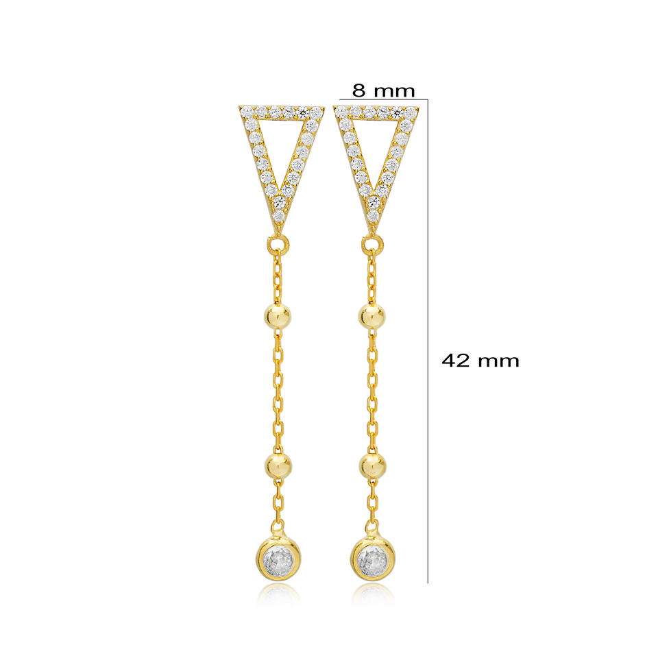 Clear Zircon Stone Long Earrings Triangle Design Turkish Handmade 925 Sterling Silver Jewelry