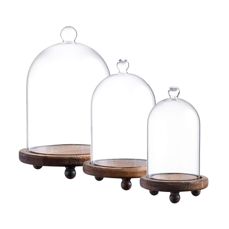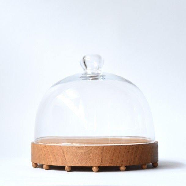 Clear glass cake dome with solid wooden serving tray and side handles premium dessert display for bakery kitchen table decor