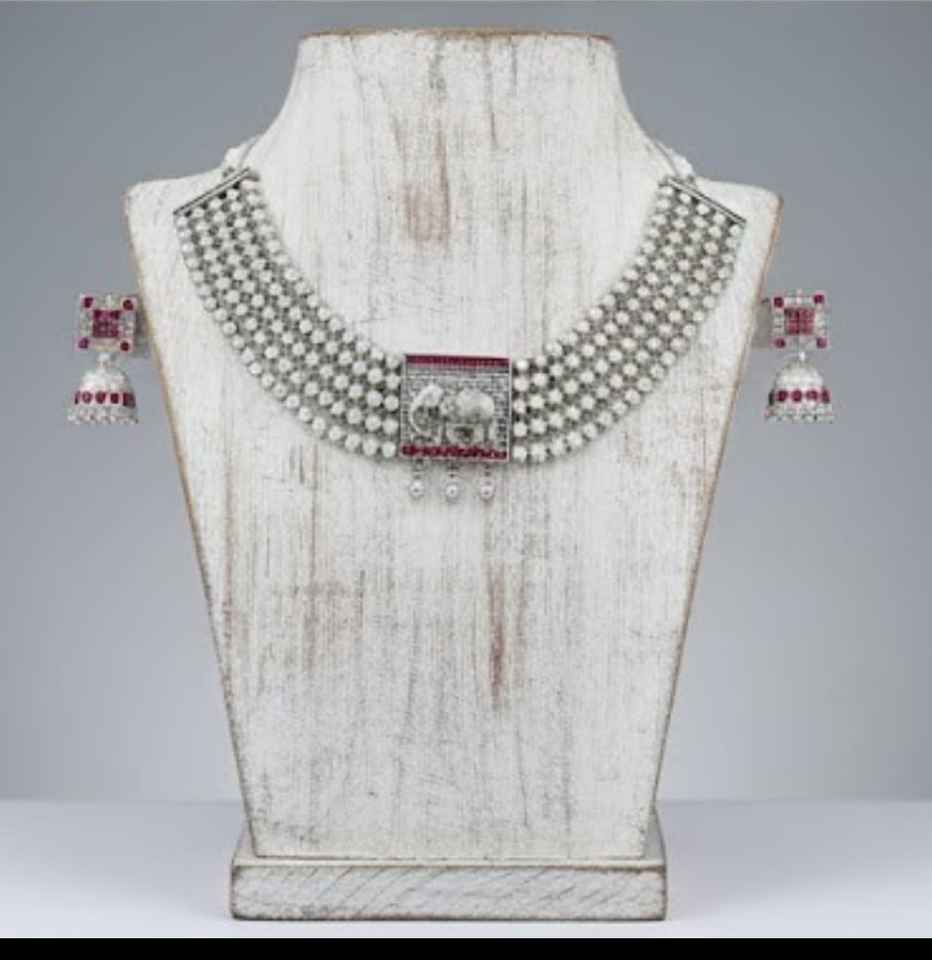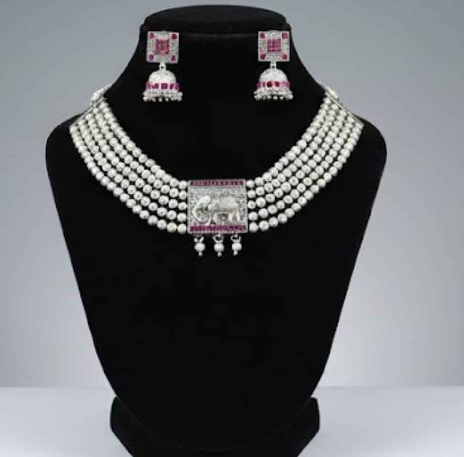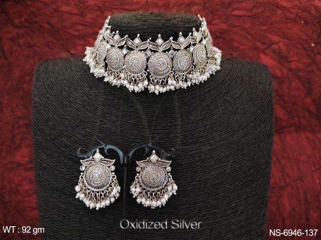 Clustered Pearl Oxidized Silver Round Shape Necklace Set Elegant Traditional Indian Ethnic Jewellery Party Wear