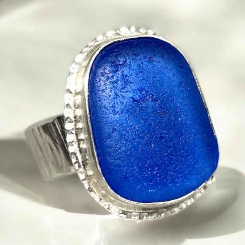 Cobalt Blue Sea Glass Ring Genuine Beach Glass Jewelry 925 Sterling Silver Rhodium Plated Handmade Ocean Inspired Unique for Her