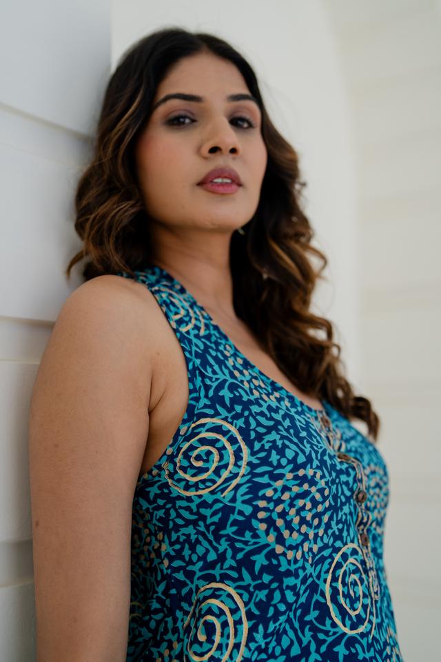 Cobalt and White Graphic Print Two Piece Set Halter Crop Top and Wide Leg Trousers Bold Summer Holiday Boho Coord Clothing