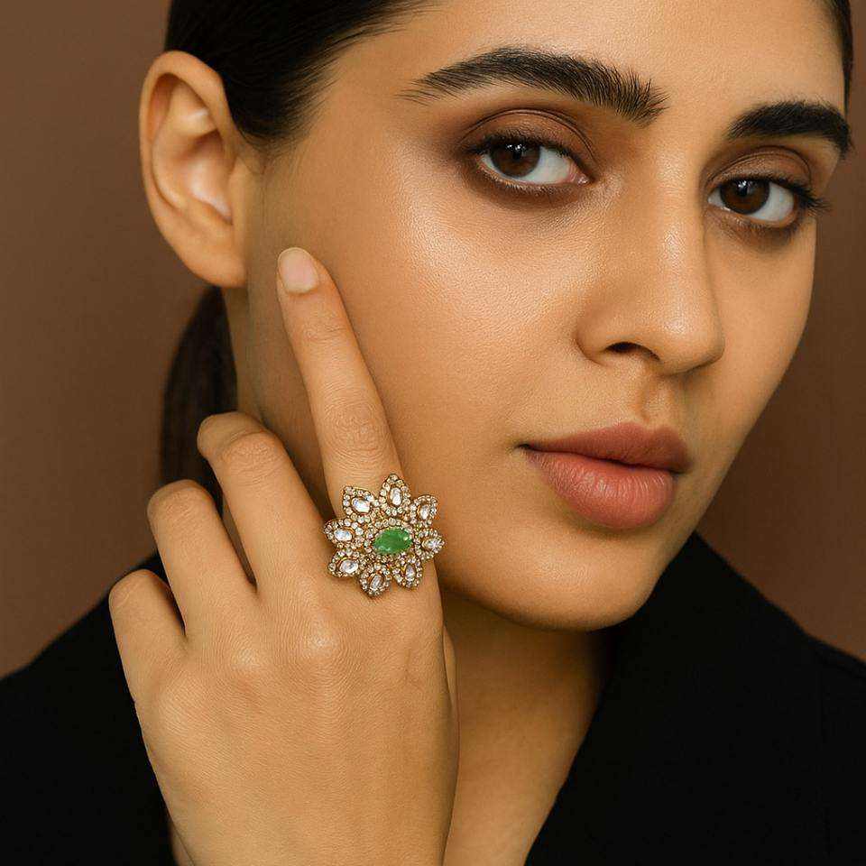 Cocktail Ring Design In Gajaah 925 Silver With Green Emerald And Polki Diamond Gold Plated Statement Ring Floral