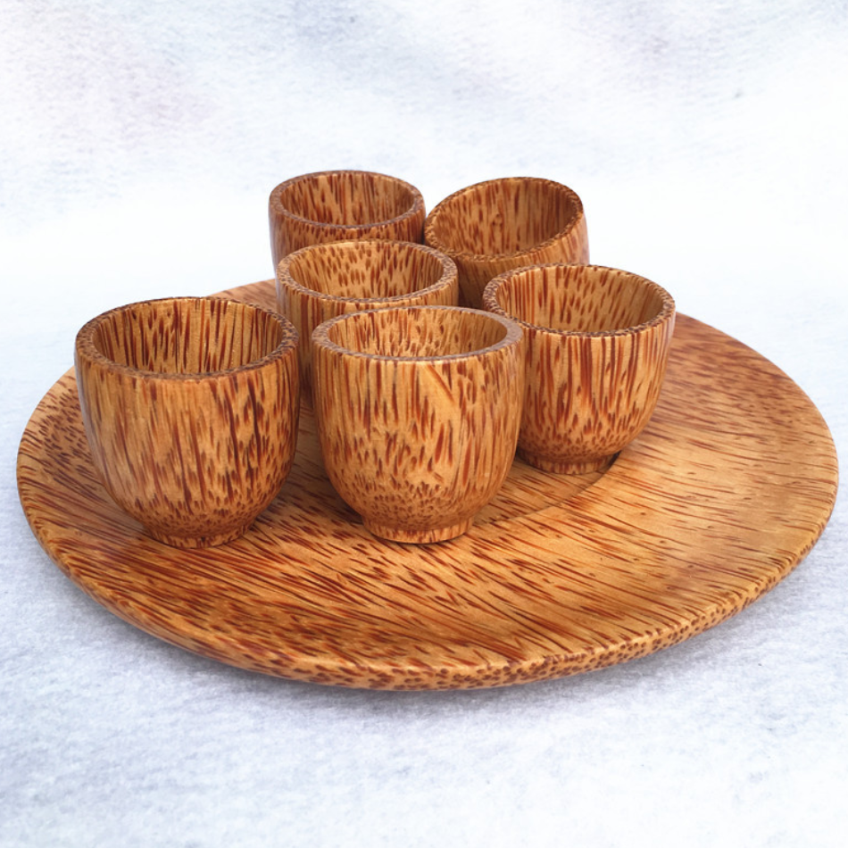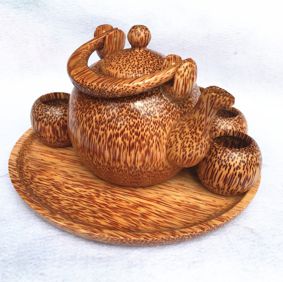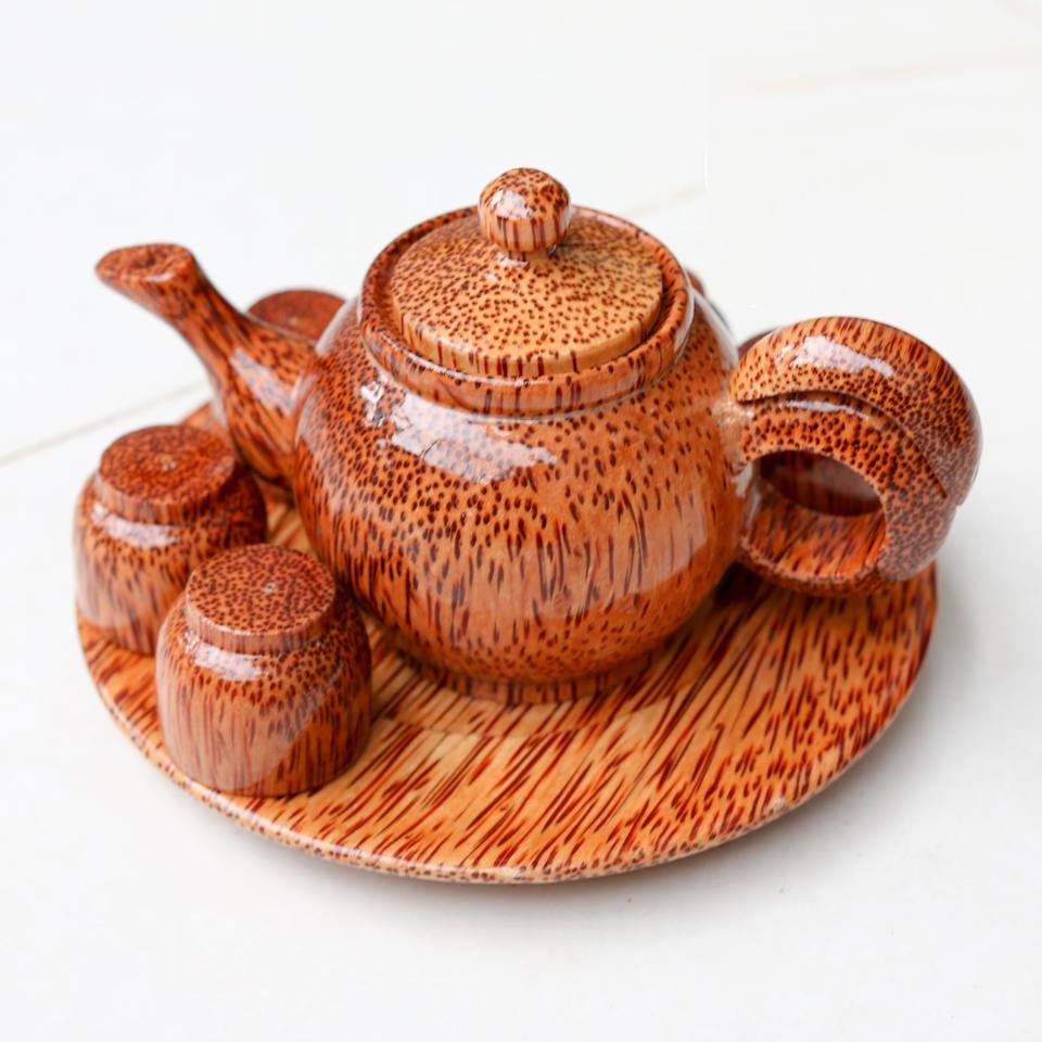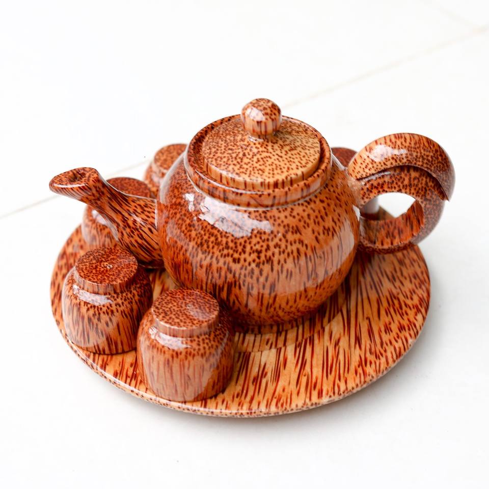 Coconut Wooden Vintage Teacup and Teapot for Tea Drinking Wholesale Tea-serving Set Made of Natural Coco Wood