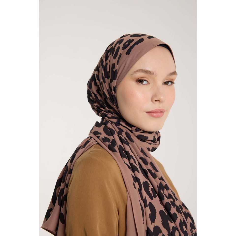 Coffee Brown Leopard Print Scarf with Pure Tone Modest Dress Accessory in Black
