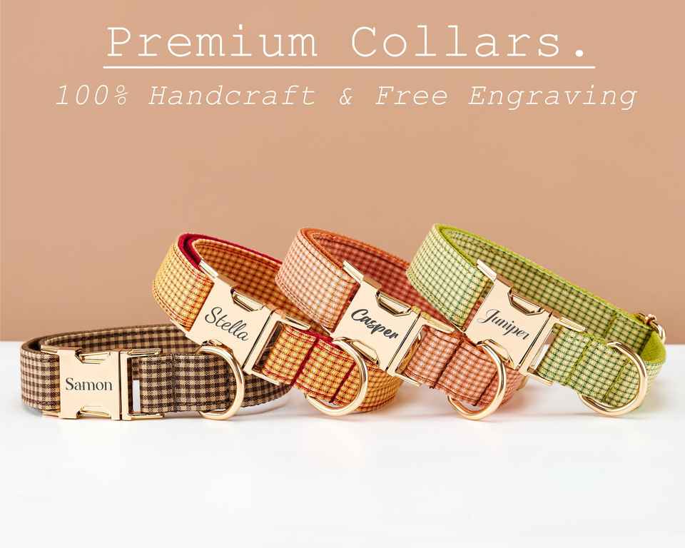 Coffee Plaid Personalized Dog Collar Bow Tie Leash Set, Custom Engraved Pet Name Metal Buckle, Unique Wedding Puppy Gift, FREE