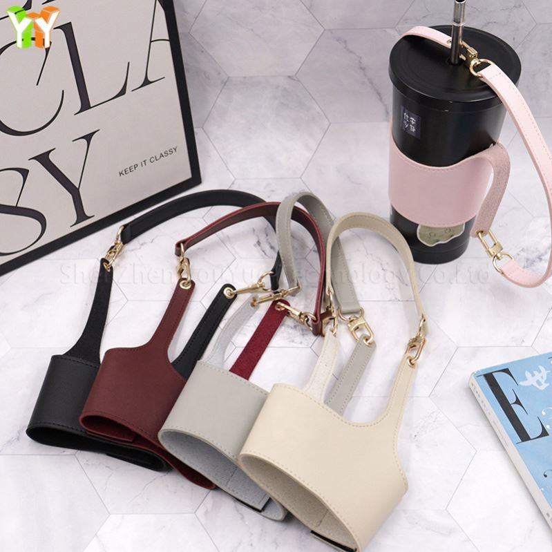 Coffee Tea Cup Protective Sleeve Water Bottle Holder PU Leather Pouch Handmade Strap Handle Custom Logo Carton Back School