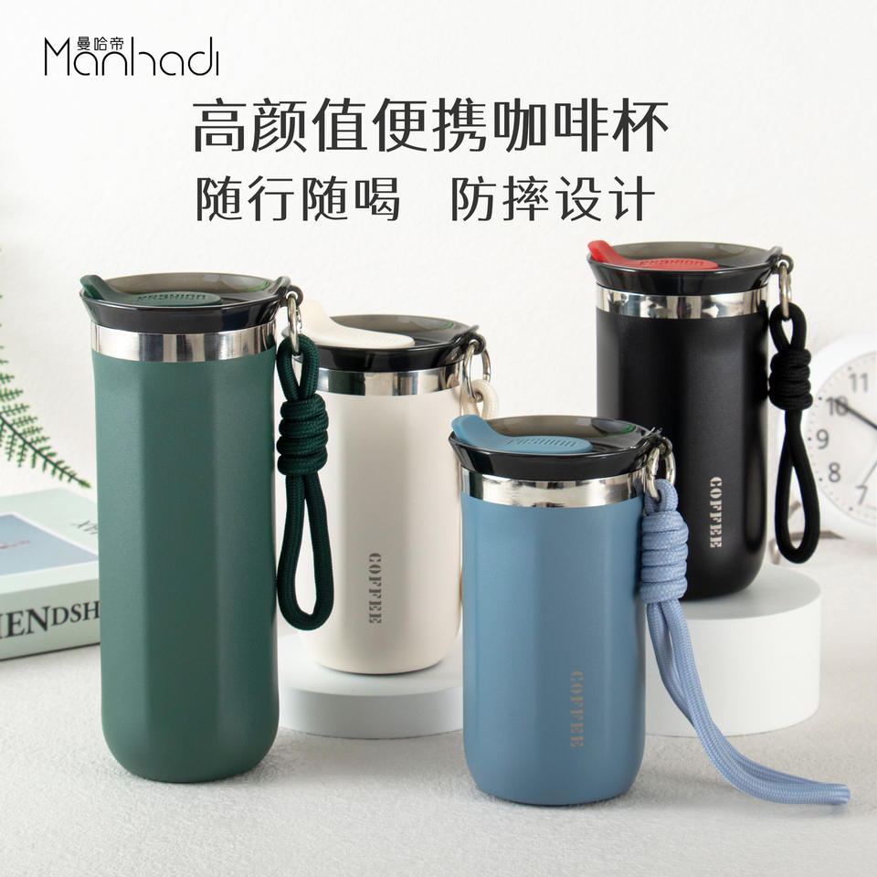 Cofpee Stainless Steel Tumbler 304 Insulated Travel Cup Black Portable With Strap Nordic Style Water Bottle