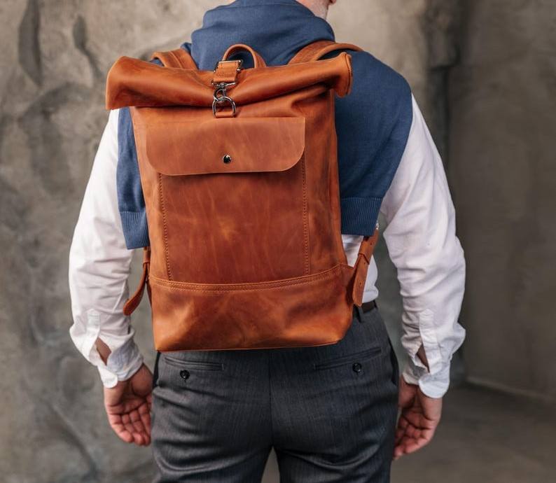 Cognac Leather Rolltop Backpack Handmade Laptop Rucksack Gift For Him Travel Bag Stylish Everyday LRTB-0085