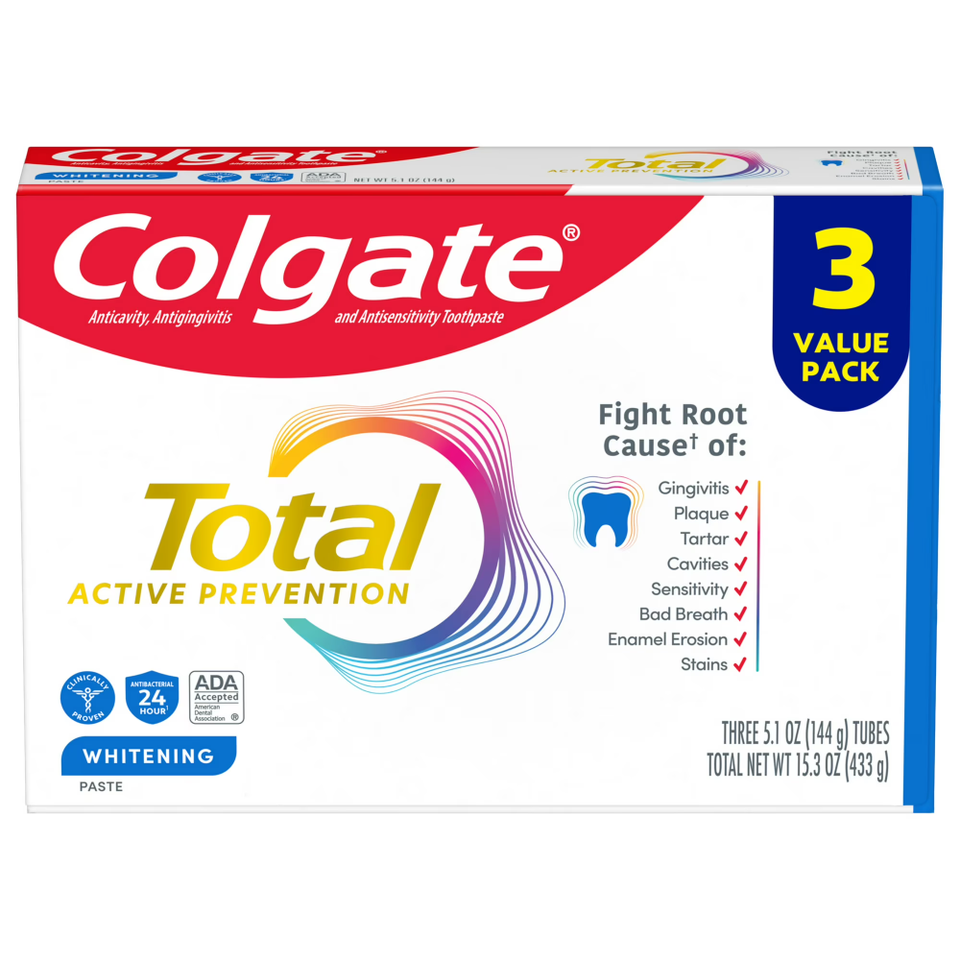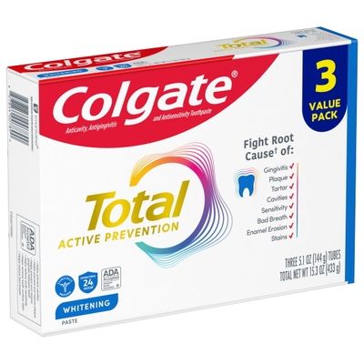 Colgate Total Active Prevention Whitening Toothpaste, Mint, 3 Pack, 5.1 oz
