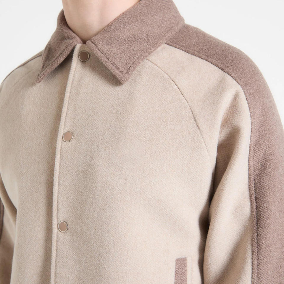 College Men's Polyester Cotton Hooded Vintage Leather Jacket Stand Collar Front Logo Beige Two-Tone Faux Fur Lining Windproof