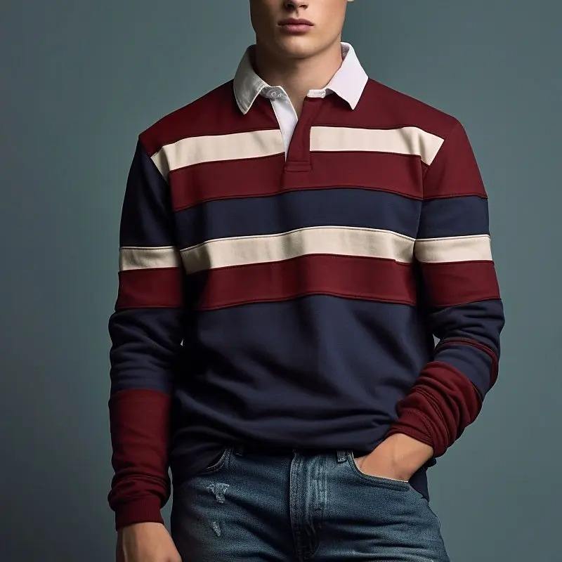 Color Stripes Print Men's Polo Shirts Daily Business Casual Long Sleeved Tops Fashion Lapel Button T-Shirt Autumn Loose Clothing
