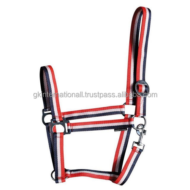 Colorful Adjustable Nylon Horse Halter in Red White Blue Combination Nylon Webbing Horse Halter with Solid Brass Hardware