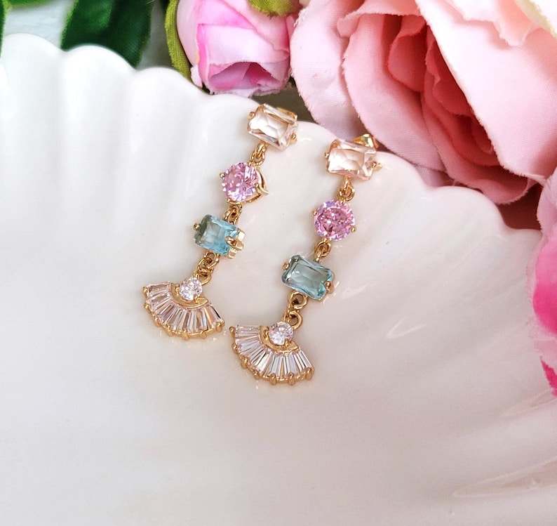 Colorful Art Deco Bridal Stud Earrings CZ Pink Aqua Crystal 925 Sterling Silver 14k Gold Plated Rhodium Plated Party Gift