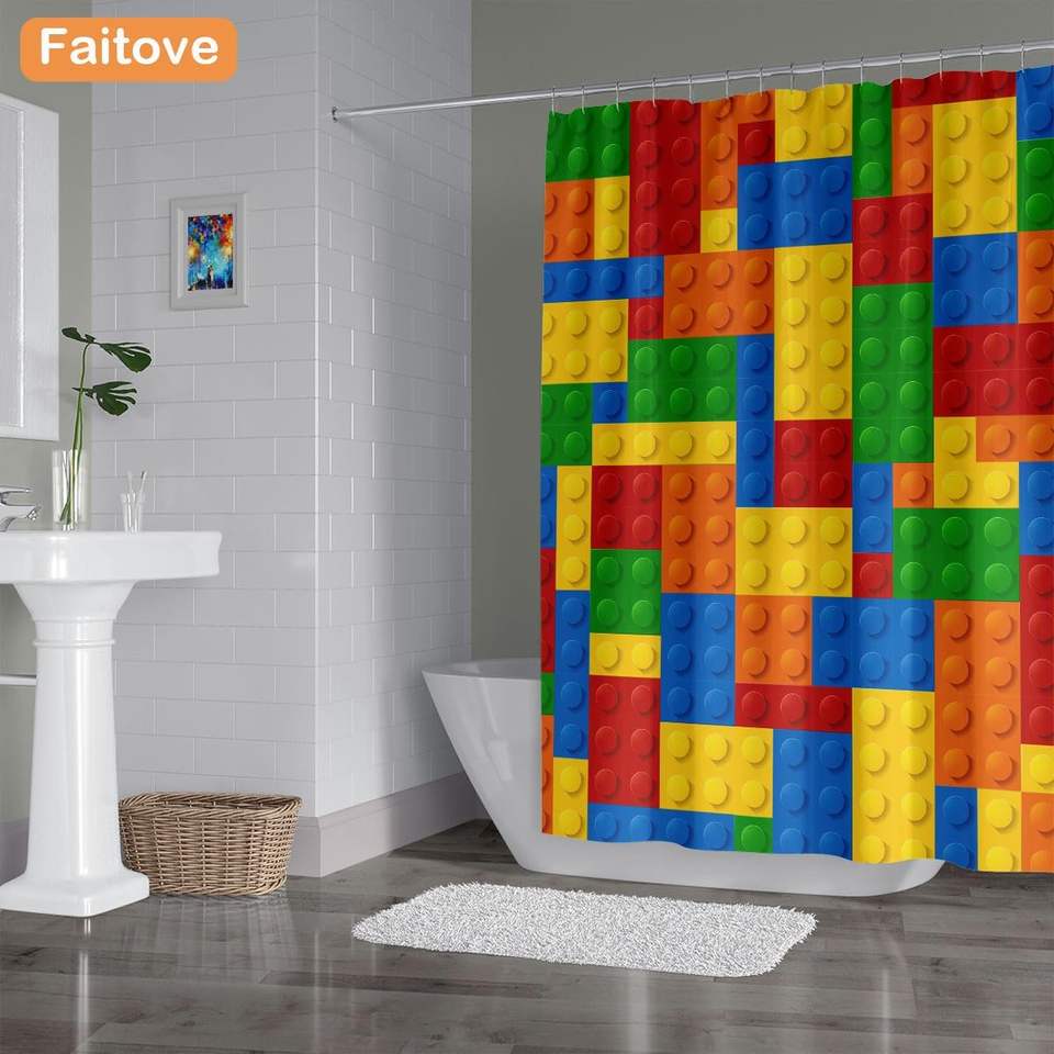 Colorful Blocks Shower Curtain Funny Waterproof Bathroom Home Decor with Hooks