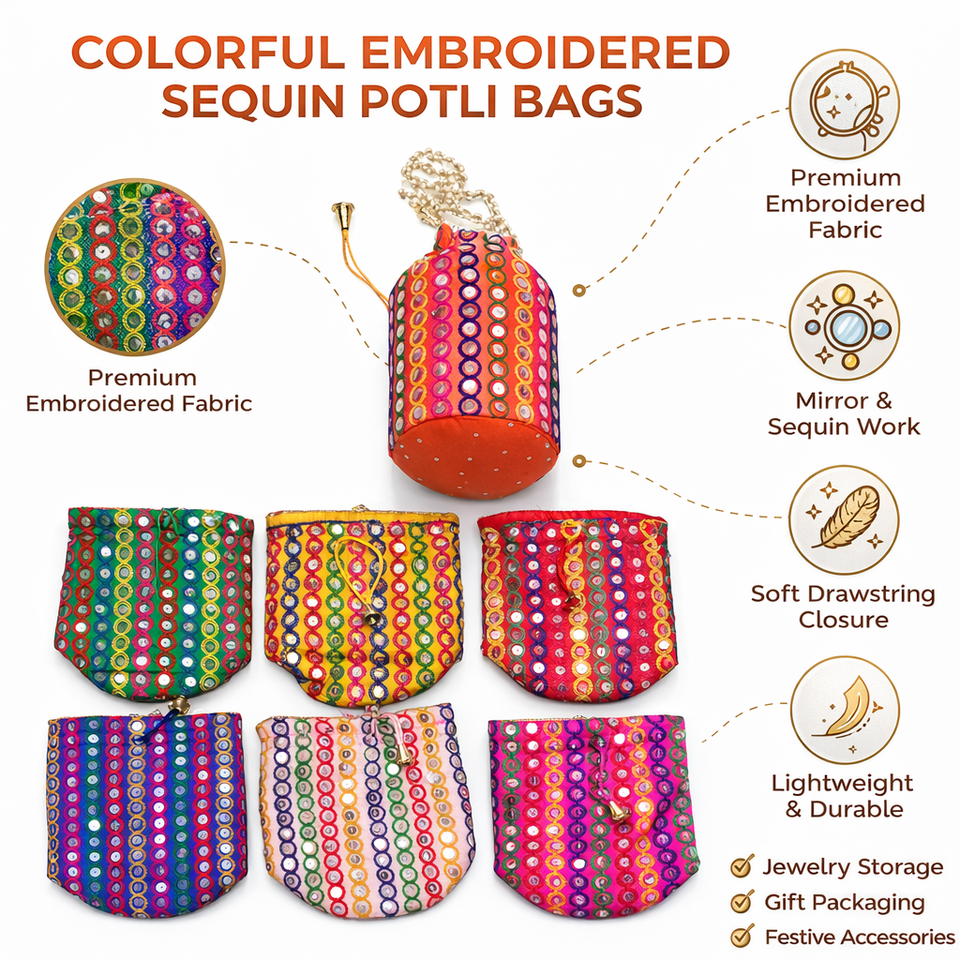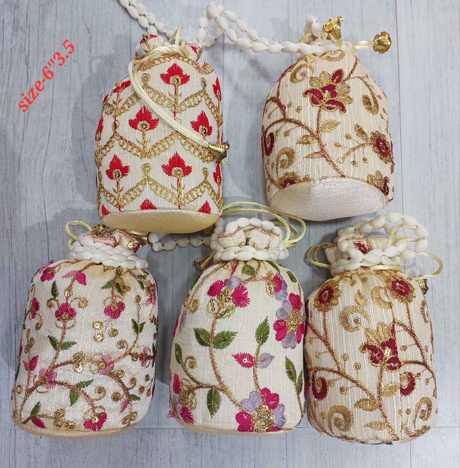Colorful Embroidered Square Potli Bags with Pearl Decorations Satin Fabric Gift & Jewelry Pouches