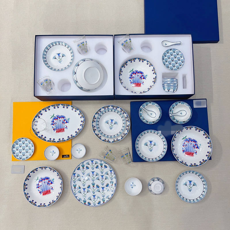 Colorful European Style 47-pcs Bone China Dinner Set Plant Pattern Charger Plate Custom Logo Made Ceramic for Business Gifts