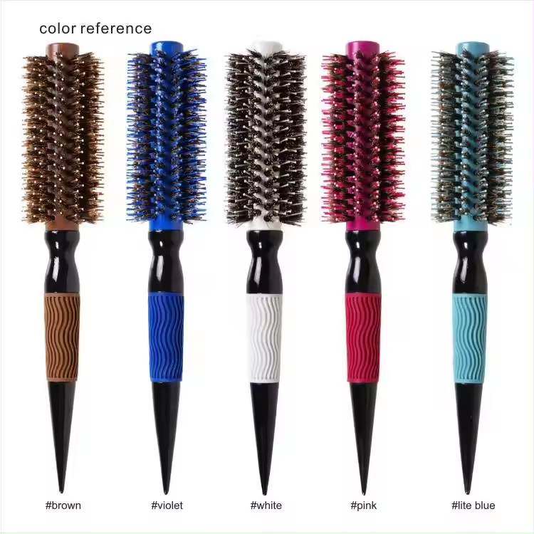 Product Description:Colored wooden full roundbrush, w/ceramic tube, rubber grip, L. size.