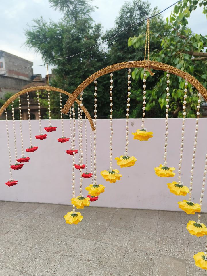 Colorful Half Moon Floral Hanging Decor with Pearl Strings Wedding Haldi Mehndi Stage Backdrop & Ceiling Chandelier Decoration