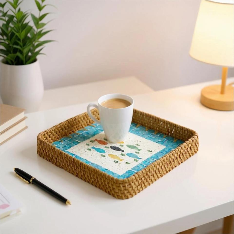 Colorful Mosaic Rattan Serving Tray Set Perfect For Coffee Tea Snacks Kitchen And Dining Table Decor Wholesale From India