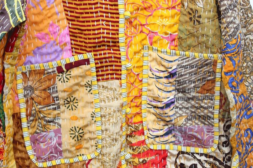 Colorful Patchwork Kantha Quilted Silk Cotton Jacket Reversible Boho Women Dress with Small Buttons Long 2-Way Jacket for Autumn