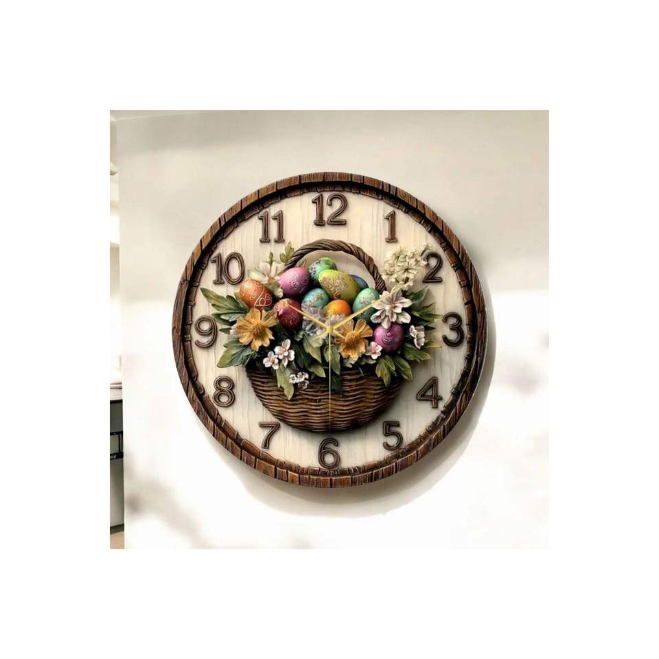 Colorful Printed Patterned Flower Basket Embossed Wooden Silent Wall Clock 50cm Gift