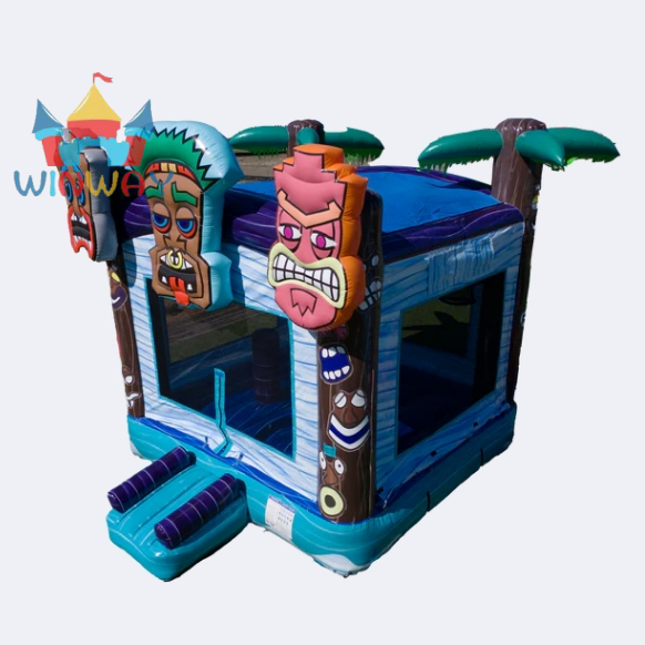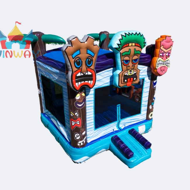 Colorful Tiki Face Inflatable Bounce House, Large Outdoor Kids' Jumper Castle, Unique Polynesian - Inspired Party Play Structure