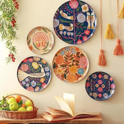 Colorful folk art wall plates, traditional tree of life, vibrant birds, elephant design, available at wholesale prices.