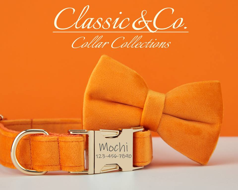 Colourful Bow Tie Lead Set,Orange Collar,Girl Dog Collar With BowTie And Leash Persnalised NamePlate