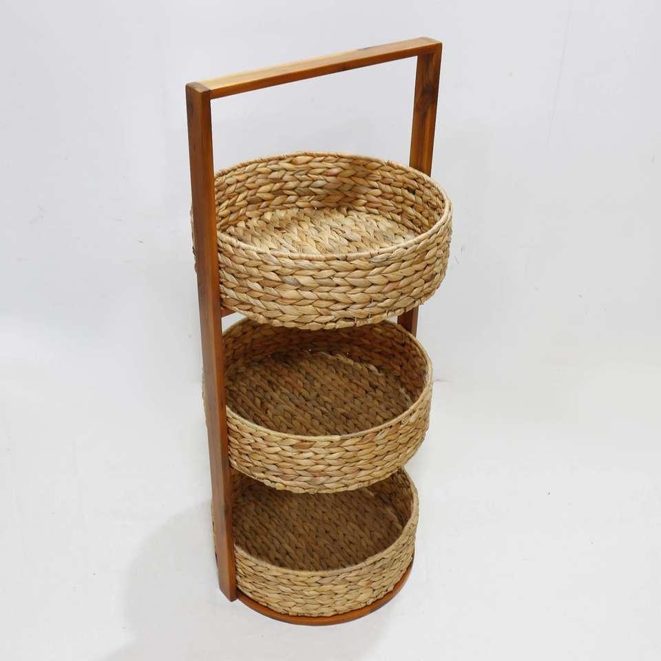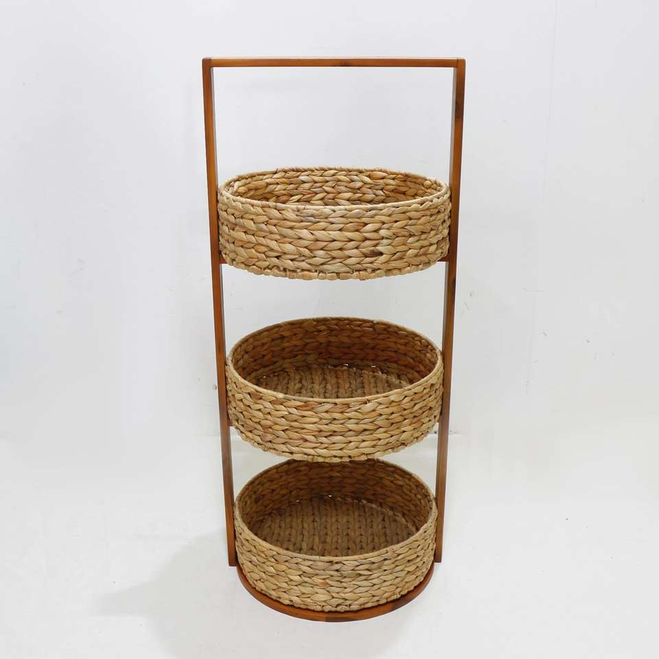 3 tier storage caddy wood leg with 3 water hyacinth baskets:
