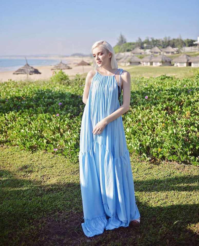 Comfortable Blue Loose Silk Maxi Dress for Women Floor Length for Summer Relaxing Days Features Natural Waistline Washable