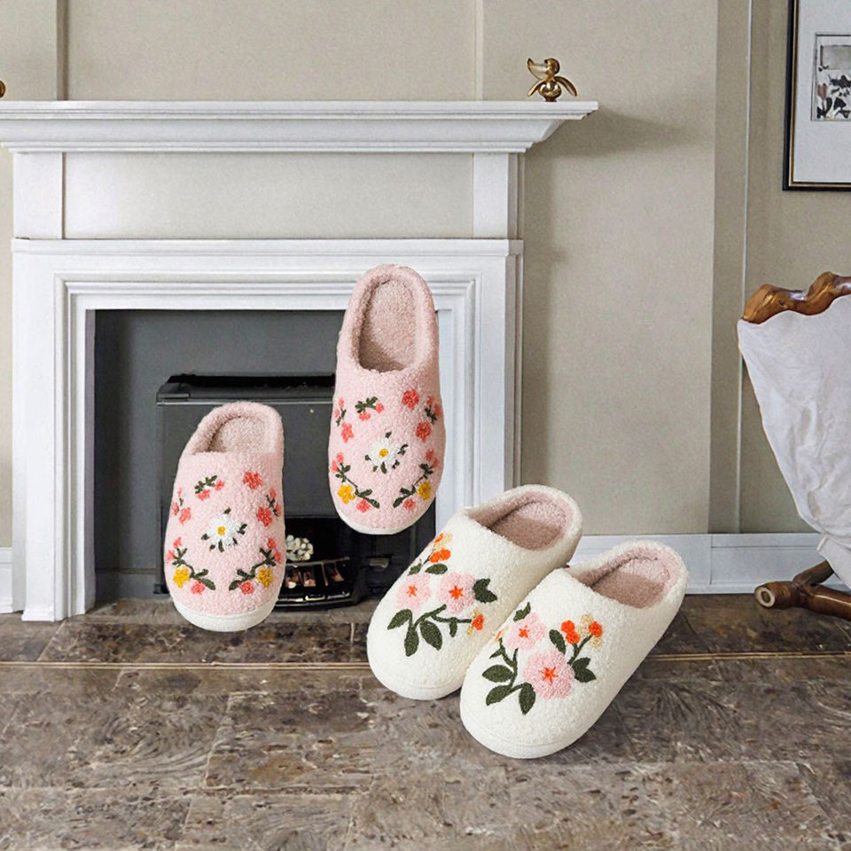 Comfortable Embroidered Flower Cotton Fleece Summer Winter Lighted Thermal No Slip Fur Home for Unisex Couple Warm Soft