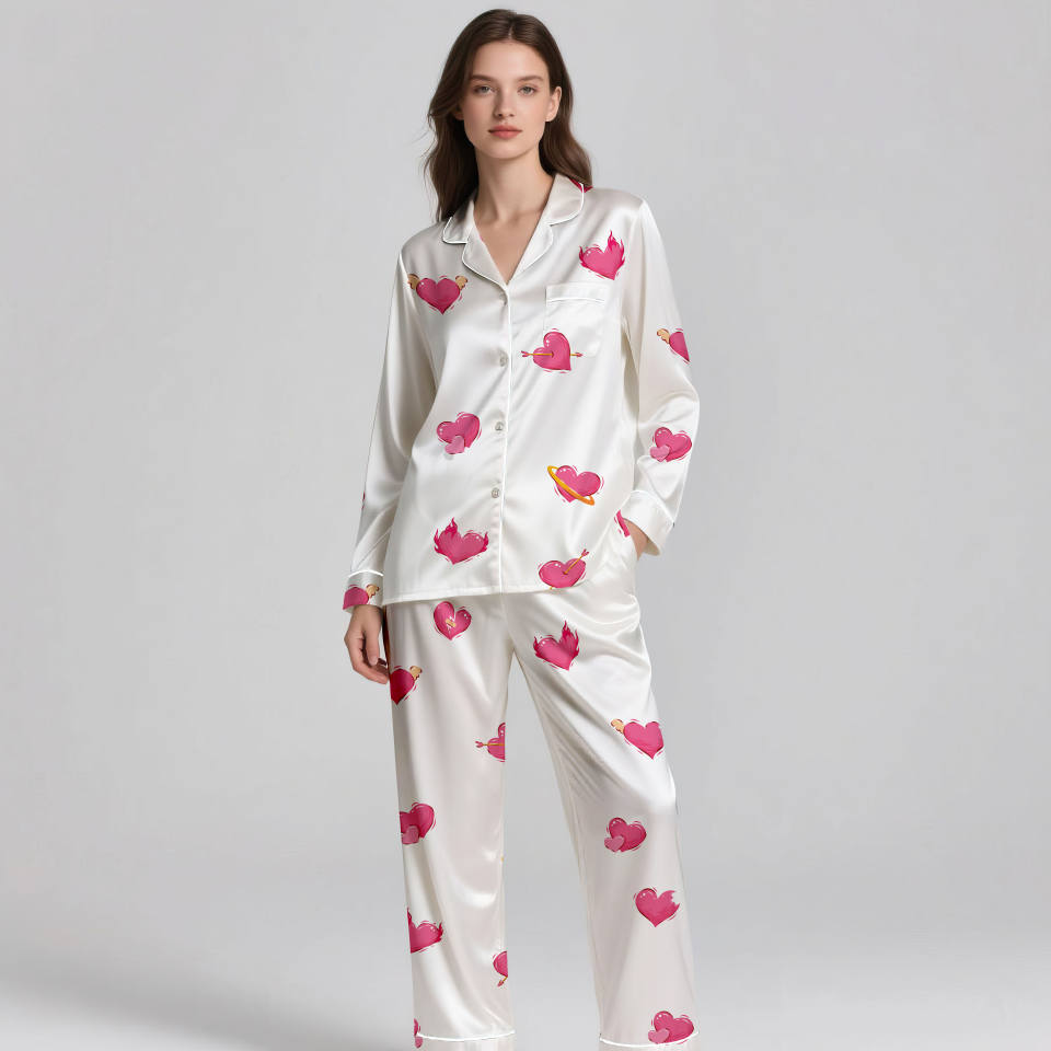 Comfy Women's Summer Sleepwear 2-Piece Long Sleeve 100% Silk Satin Pajama Set Cute Loungewear Christmas Design