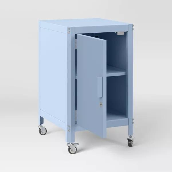 Compact Blue Metal Cabinet on Wheels with Lockable Doors and Adjustable Shelves for Easy Office Storage