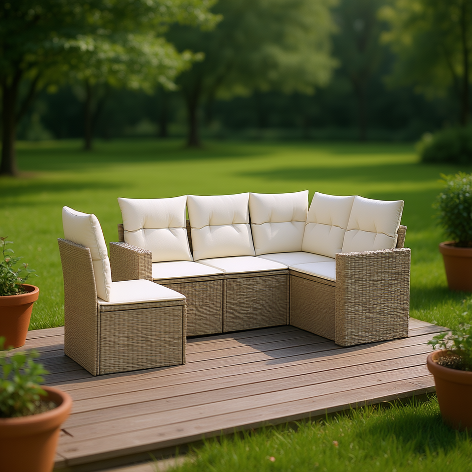 Compact Modular Beige PE Rattan Garden Sofa Set Outdoor Seating Solution Modern Design High-Density Foam Cushions