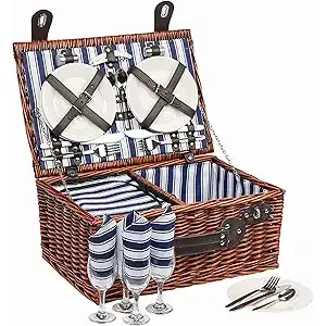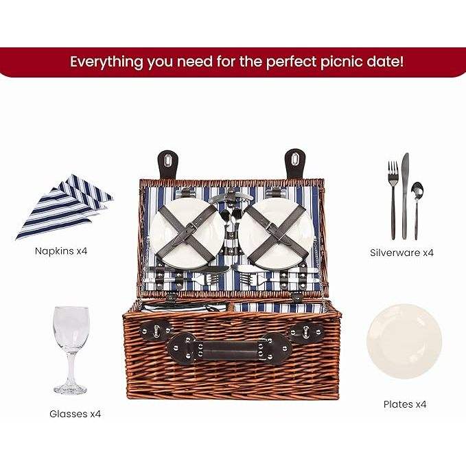 DreamCraft Compact Picnic Basket Set Secure Latches Leather Handle 4 Plates Silverware Insulated Cooler Vietnam for Picnics