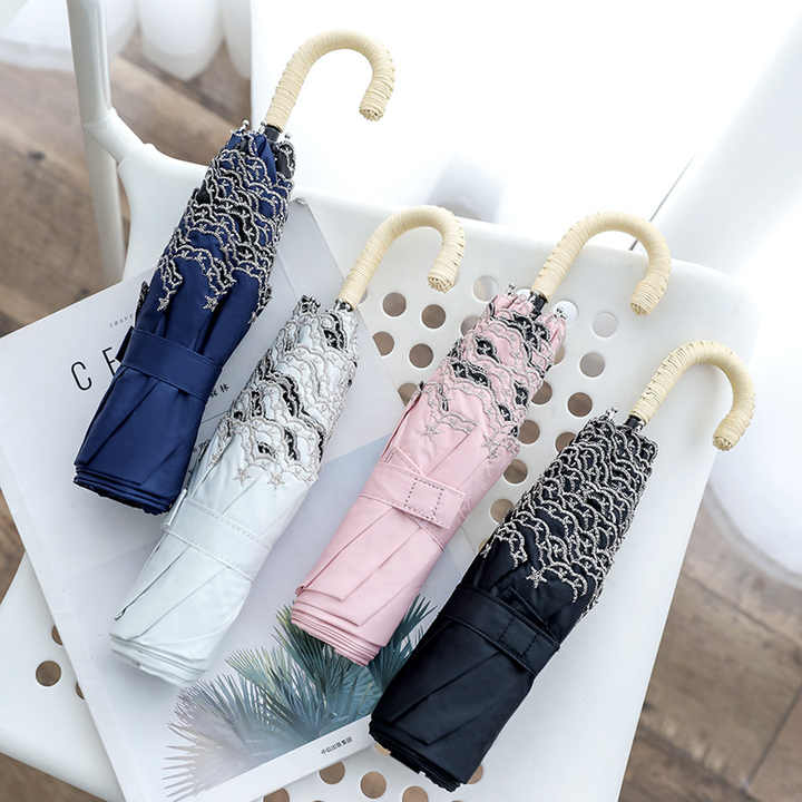 Compact Portable Curved Handle UV Protective Super Lightweight Vintage Lace Flower Embroidery Custom logo Folding Umbrella
