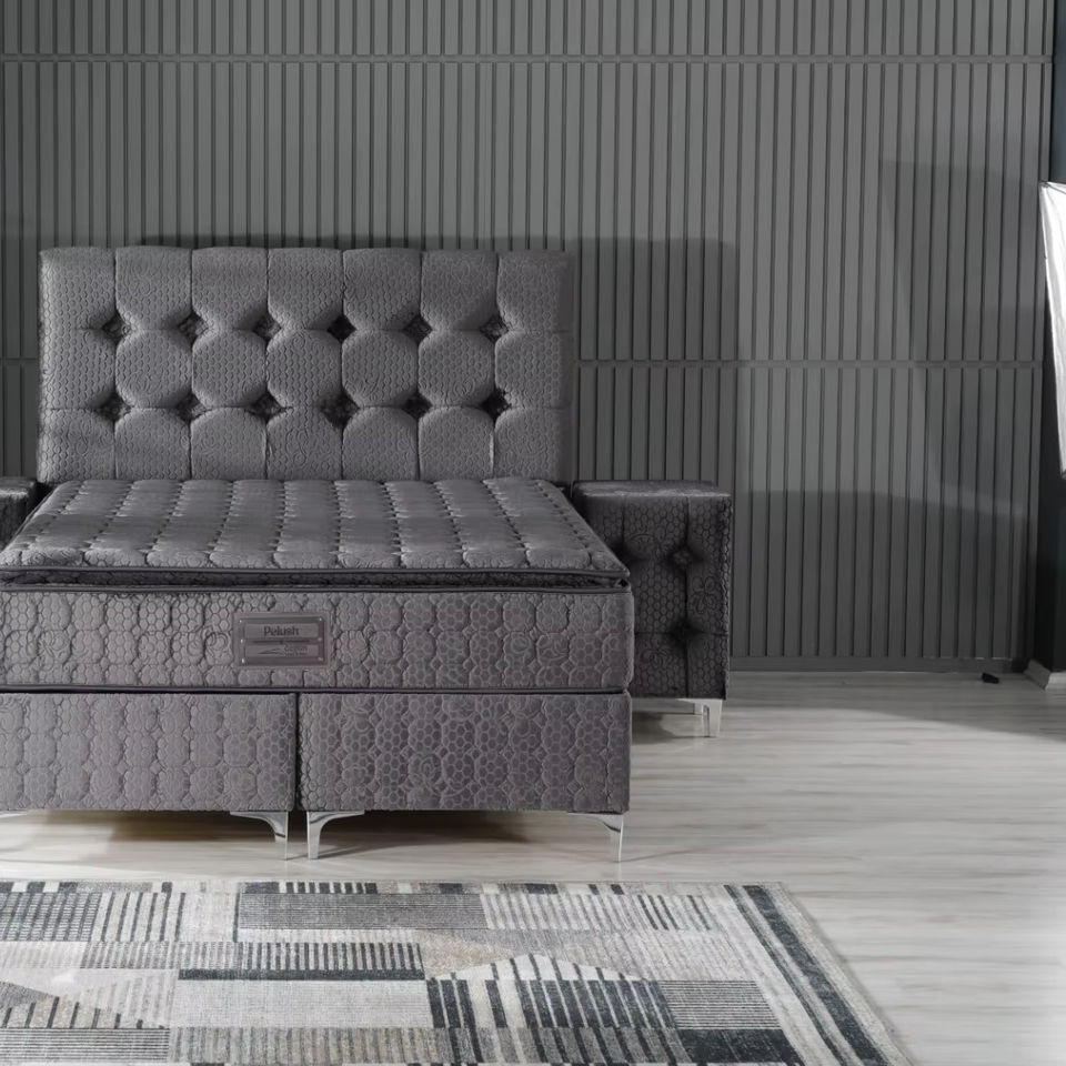 Complete Grey Upholstered Bed Set with Button-Tufted Headboard and Steel Legs Full Comfort Design type 6