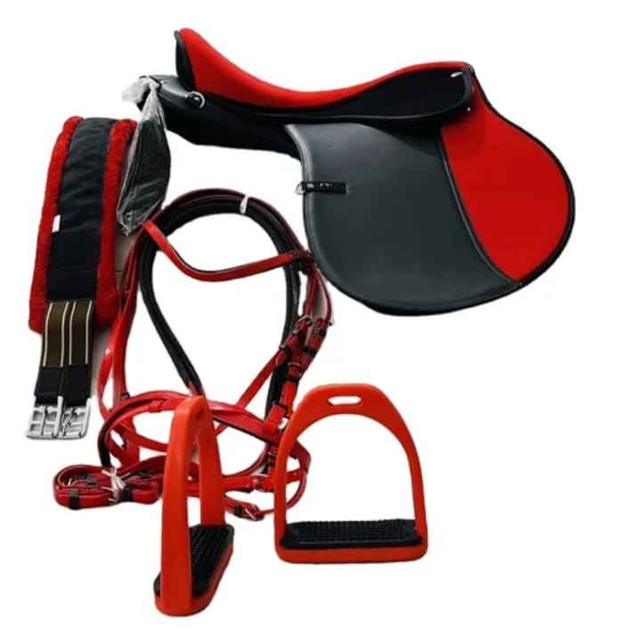 Complete Red and Black Synthetic Jumping Saddle Set for Equestrians"