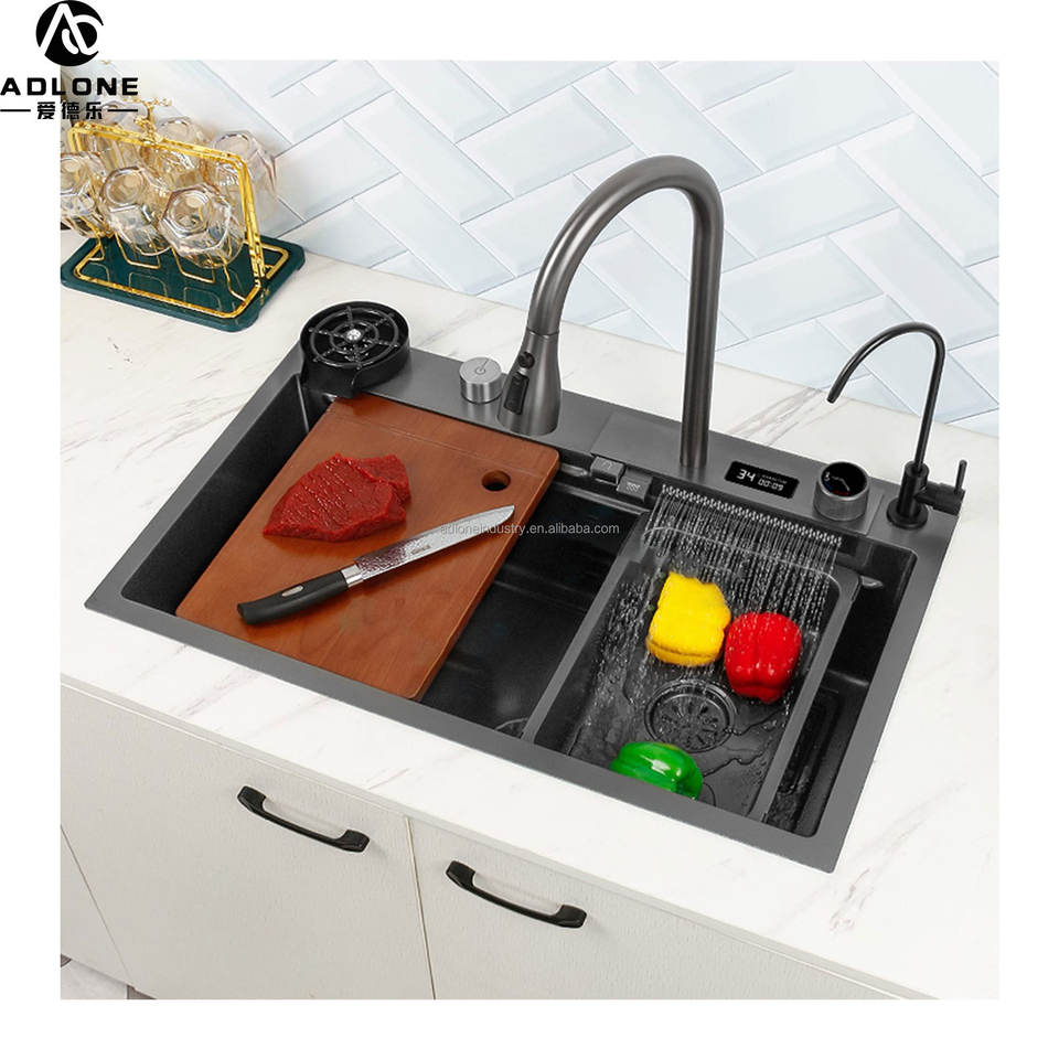 Complete Whole Set Waterfall Kitchen Sink Stainless Steel Sinks Big Single Bowl With Dish Rack Under Mount Sinks