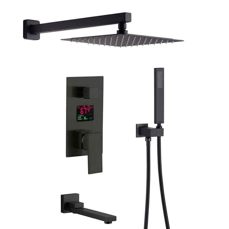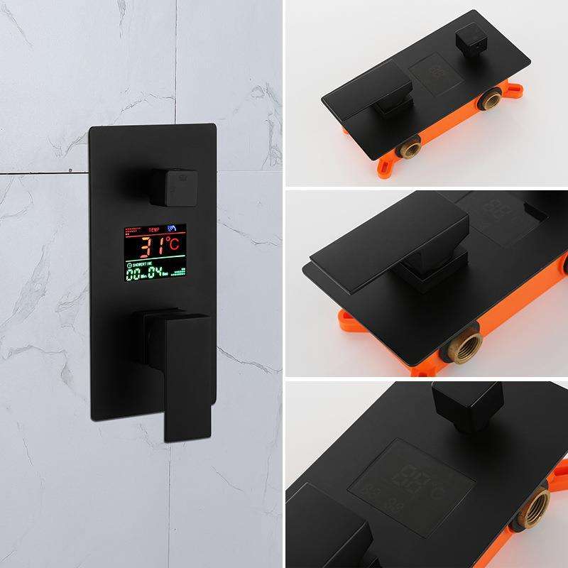 Concealed Rotatable Shower Set Square Rainfall Head Thermostatic Temperature Display Black Finish Ceramic Valve Bathroom Faucet