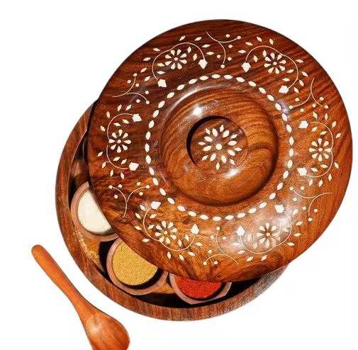 Condiments Organizer Box Round Shaped Spice Box Wooden Masala Storage Container Kitchen Spice Box with Spoon