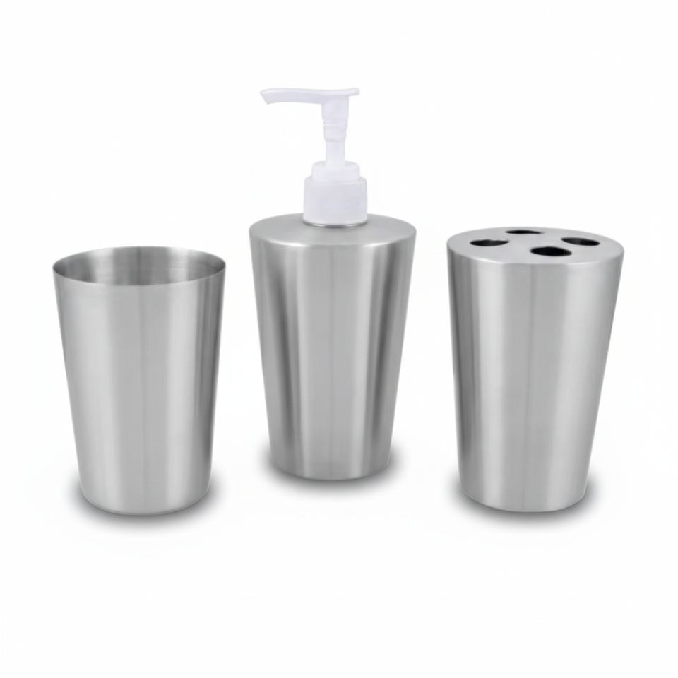 Conical Design Stainless Steel Bath Set Includes Soap Dispenser Tumbler and Toothbrush Holder for Everyday Use or Hotels